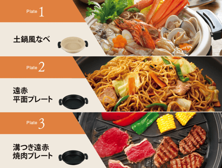 「土鍋風大型なべ」「遠赤平面プレート」「平面スペースつき溝つき遠赤焼肉プレート」の3枚タイプ