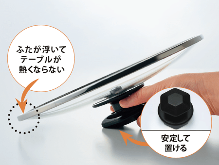 斜めに置けるふたなので、熱いふたに手が触れにくく、また、つまみ上部がフラットなので裏返しても安定して置けます。斜めに置いてもふたの縁が浮くのでテーブルが熱くなりません。