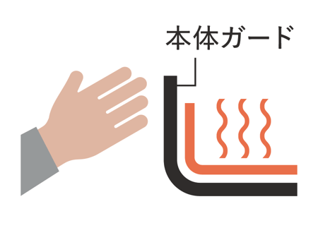 焼肉や炒め物などを調理する時、プレートのふちは非常に高温になっています。本体ガードがプレート面より高くなっているため、熱いプレートのふちに手が触れにくい安心設計です。