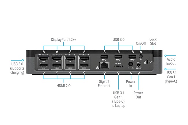 4K 拡張ディスプレイを提供する世界初のエンタープライズ クラスのユニバーサル ドッキング ステーションで、生産性とパフォーマンスを向上させます。大企業に最適 - Targus USB-C™ Universal Quad 4K (QV4K) ドッキング ステーションは、ワークステーションの表示を最大化します。デュアル DisplayLink® DL-6910 チップ テクノロジーは、最大 4 つの DisplayPort (3840 x 2160 p60) または HDMI (3840 x 2160 p50) ディスプレイをサポートします。ドッキング ステーションには、必須の USB 3.0 周辺機器とイーサネット ネットワークを接続するための多数の追加ポートが含まれています。