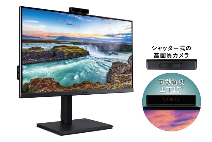 フレーム上部に上15°/下15°の角度調整が可能なWebカメラ*2を標準搭載。マイク付のため、ビデオ会議や動画配信などを快適に行えます。モニター本体は上35°/下5°のチルト機能で最適なアングルに設定可能。カメラはシャッター付のため、プライバシーも安心です。