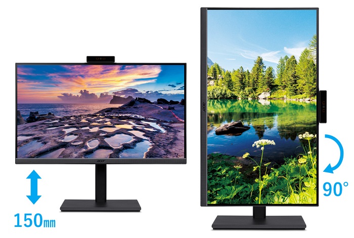 画面を90°回転できるピボット機能により、タテ画面表示が可能です。高さ調整最大150mm、首振り角度は左右45°。表示内容や場所に合わせて、自由なポジションに。