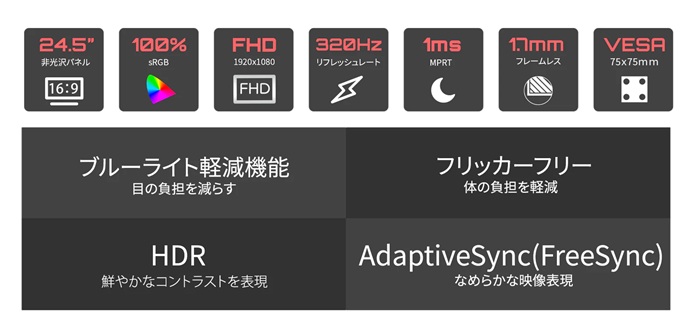 24.5” IPSパネル 320Hz対応 FHDゲーミングモニター
