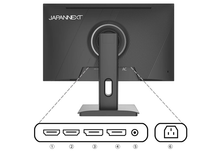 | ①HDMI-2:2.0 (1920x1080) @240Hz ②HDMI-1:2.0 (1920x1080) @240Hz ③DP-2:1.2 (1920x1080) @320Hz ④DP-1:1.2 (1920x1080) @320Hz ⑤オーディオ出力 ⑥電源ポート |