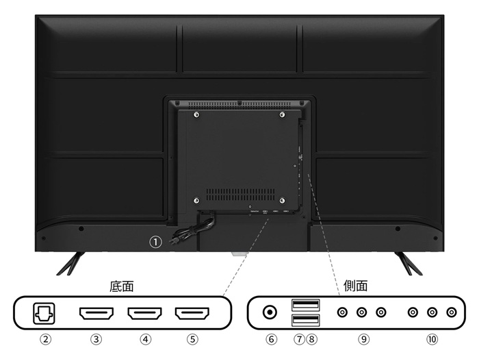 | ①電源ケーブル(プラグイン) ②オプティカル音声出力 ③HDMI -1 :1.4 (1920×1080) @60Hz(ARC/CEC対応) ④HDMI -2 :1.4 (1920×1080) @60Hz ⑤HDMI -3 :1.4 (1920×1080) @60Hz ⑥イヤホン出力 ⑦USB-A: USBメモリ再生対応(5V / 0.5A) ⑧USB-A: USBメモリ再生対応(5V / 0.5A) ⑨ビデオ/音声入力 ⑩コンポーネント入力 |