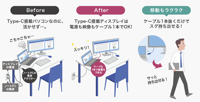 本商品とノートPCをUSB Type-Cケーブルで接続することにより、映像や音声の入力、ノートPCへの給電および充電がケーブル1本で行われ、使用するコンセントも最小限に抑えられます。打ち合わせはもちろん、出張や外出時もケーブル1本抜くだけでノートPCをすぐ持ち出せます。