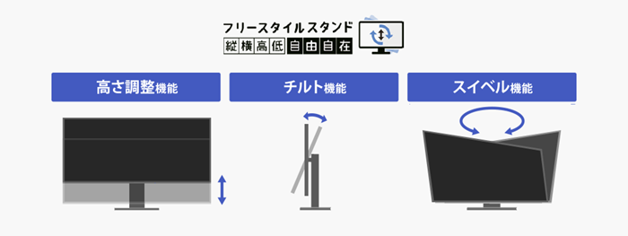 本商品は「フリースタイルスタンド」を採用!見やすい位置に高さや角度を調整することで、目や肩の疲れやストレートネック対策の一つとしても効果的です。お好みの姿勢をとれるので、長時間、ゲームや動画を見ても疲れにくく、より集中できます。
