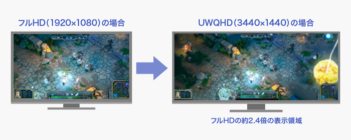 UWQHDとは、フルHD(1920×1080)の約2.4倍の表示領域を実現する3440×1440ドットの解像度です。フルHDと比べると、より広く情報を表示できるので、スクロールの手間を省き、全体を広く見ることができます。たとえば、メニューやツールボックスなどを表示しつつも、メイン画面の部分を広く使えることができるので、ゲームをより快適に楽しむことができます。