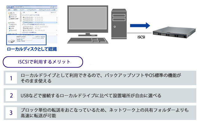 ハードディスクなどの記憶装置の接続で利用されるSCSIコマンドを、ネットワーク上で受け渡しができるようになるiSCSIターゲット機能を利用できます。本商品をiSCSIターゲットとして設定することにより、既存サーバーのローカルディスクとして、容量増設やバックアップ先ストレージにご利用いただけます。