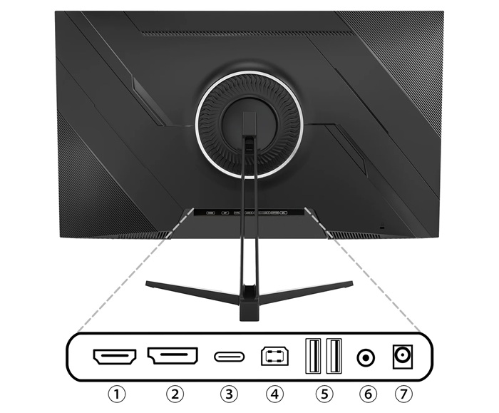 ①HDMI:2.0 (3840x2160) @60Hz ②DisplayPort:1.2 (3840x2160) @60Hz ③USB-C:3840x2160 @60Hz 65W給電 ④USB-B:KVM ⑤USB-A×2:2.0 KVM/給電(5V/0.5A) ⑥オーディオ出力 ⑦電源ポート |