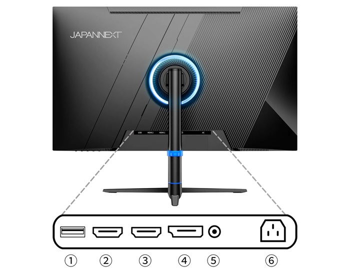 | ①USB-A : 2.0 ファームウェア更新用 ②HDMI-2 : 2.0(3840x2160)@60Hz ③HDMI-1 : 2.0(3840x2160)@60Hz ④DisplayPort : 1.4(3840x2160)@60Hz ⑤イヤホン出力 ⑥電源ポート |
