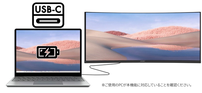 USB-C ケーブル1本で、PC本体への最大65W給電とモニターへの映像出力が可能です。