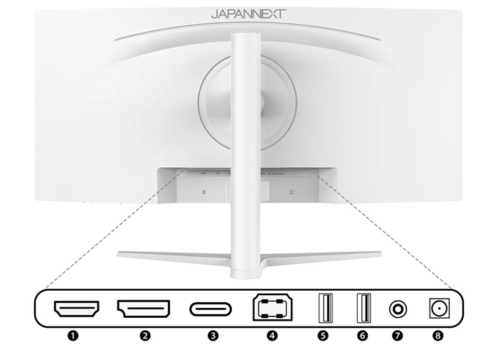 ①HDMI : 2.0 (3440x1440) @60Hz ②DisplayPort : 1.2 (3440x1440) @60Hz ③USB-C : 3440x1440 @60Hz 最大65給電 ④USB-B : KVM ⑤USB-A1 : 2.0 (KVM) ⑥USB-A2 : 2.0 (KVM) ⑦オーディオ出力 ⑧電源ポート |