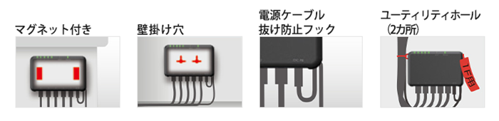 標準添付のマグネットで金属壁面への取り付けが簡単に行えます。スチールのデスクやラックへの取り付けにも最適です。また、マグネットが使えない非金属壁面へは、壁面取り付け穴での取り付けが可能です。本体側面のユーティリティホールには結束バンドやタグを付けることができます。