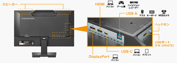 パソコンとの接続に便利なUSB Type-CとDisplayPort、AV機器との接続に便利なHDMIを搭載しています。さらに、USBハブ(USB-A×2)を搭載しているため、マウスやキーボード、Webカメラの接続にも便利です。