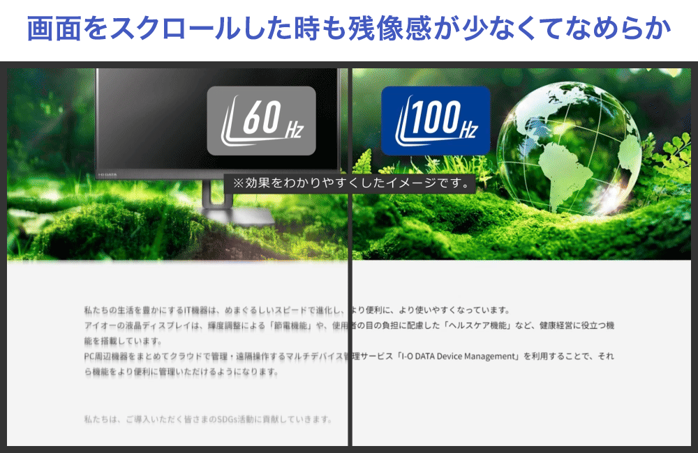 一般的な60Hzのディスプレイより、約1.6倍高速に映像が書き換わります。画面のスクロールもスムーズになるため、WebサイトやPDFの資料などの閲覧でも残像感が軽減され、視認性が向上します。