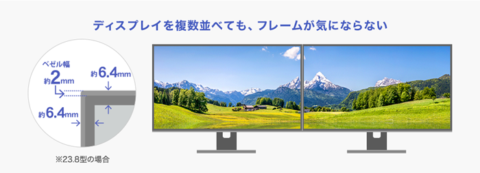パネルとフレーム(枠)による段差がないフラットなフレームレスパネルを採用しました。極細フレームですっきりした印象を与え、マルチディスプレイにもオススメです。