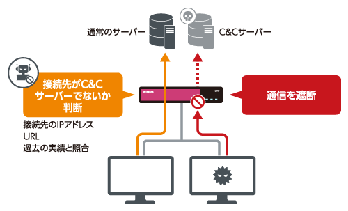 ボットに感染した端末とC&Cサーバー(遠隔操作のための指令を送るサーバー)との通信を検出し、通信の内容からボットの種類を判別することができます。情報漏えいや更なるマルウェアへの感染を防止します。