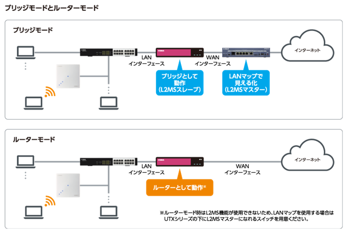 ブリッジモードでUTXシリーズを導入する場合 | ルーターモードでUTXシリーズを導入する場合 |