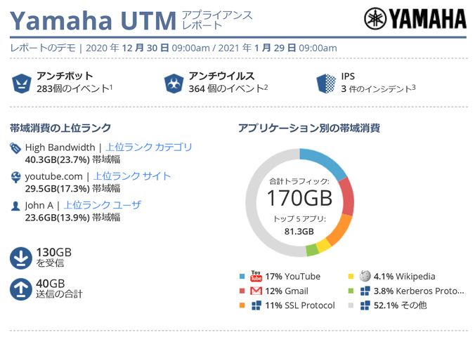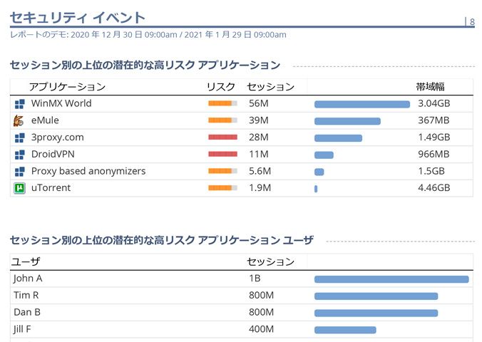 UTX100/200にはレポート作成機能が搭載されています。「検知された脅威」「感染したデバイス」「アプリケーションの使用状況」などを簡単に確認することができ、セキュリティリスクとネットワークの通信状況を可視化することができます。