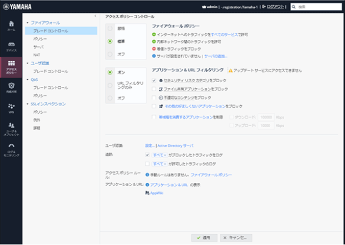 ユーザーのIPアドレス、アプリケーション、通信プロトコルなどを基にしたルールを作成し、通信を管理することができます。またユーザーやグループ別にネットワークアクセスの制限や利用帯域を細かく設定できます。Active Directoryサーバーと連携してアクセス制限を設定することも可能です。