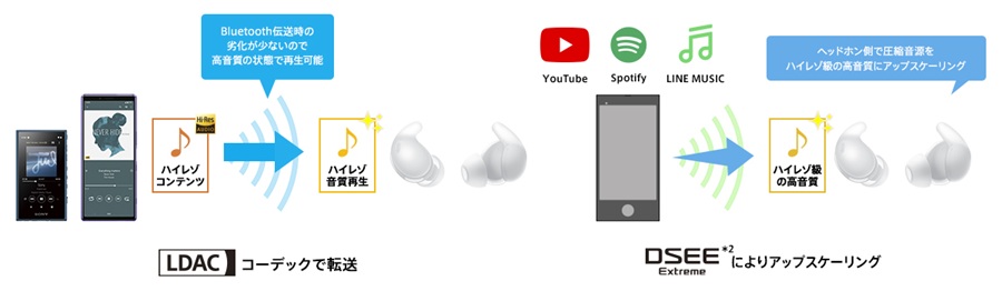 *3 DSEE Extreme ON時にCDやMP3などの圧縮音源をSBC/AAC/LDACのコーデックでBluetooth再生する際、最大96kHz/24bitまで拡張(再生機器の仕様によっては圧縮音源をLDACで伝送する場合でもDSEE Extremeが無効になる場合があります)。