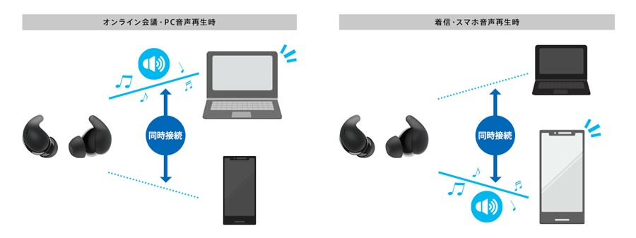例えばプライベートスマホと会社のパソコンに接続しておけば、通勤中はスマホで音楽やコンテンツを視聴し、出社後はパソコンを開けば、イヤホンのBluetooth接続をし直す必要がなく、そのまま同じイヤホンでオンライン会議のイヤホンマイクとして通話が可能です。