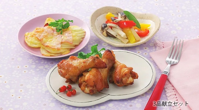 過熱水蒸気で複数のおかずを同時に作れる「3品献立セット」好みの主菜1品と副菜2品を組み合わせて同時に加熱できます。普段のおかず作りに役立ちます。 |