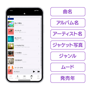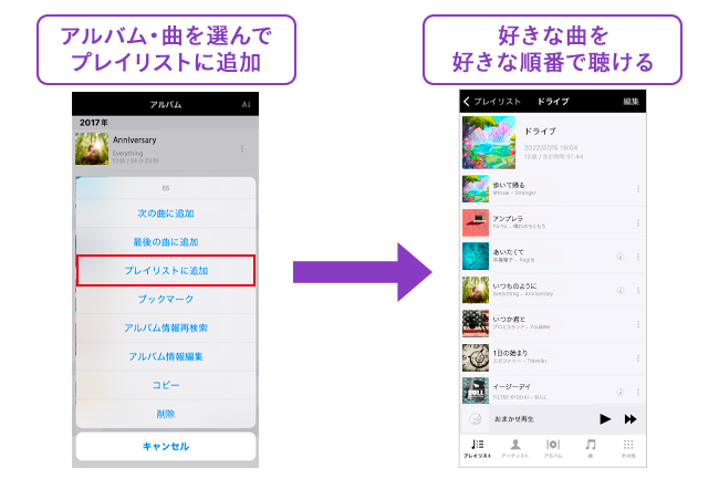 プレイリストを作成すると、たくさんの曲から、好きな曲を好きな順番で聴くことができます。