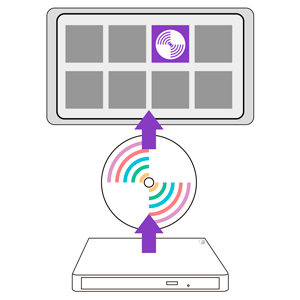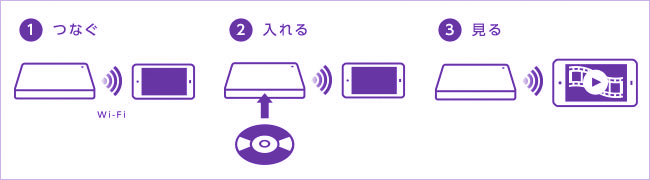 スマートフォンの視聴用アプリ「DVDミレル」をインストール。スマートフォンと本商品をWi-Fiでつなげば、あとはDVDをセットしお気に入りのDVDビデオを楽しむことができます。