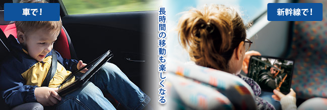 モバイルバッテリーがあれば、旅行や出張の際などのバスや新幹線のなかでもDVDを楽しめます。またドライブ中の後部座席で、お子さんとDVDを見て楽しむこともできます。