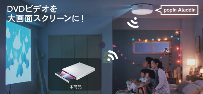 popIn社製のプロジェクター付きシーリングライト「popIn Aladdin(ポップイン・アラジン)」に対応しています。ご家庭のWi-Fi環境にてpopIn Aladdinと接続することで、壁に投影された大迫力のDVDビデオをお楽しみいただけます。