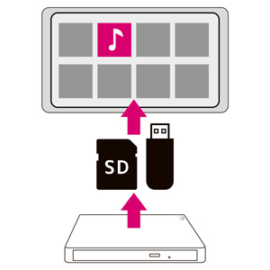 DVDだけでなく、SDカードやUSBメモリーにバックアップできます。大容量の音楽データがDVD1枚に収まらないときでも、SDカードやUSBメモリーなら大容量バックアップができます。