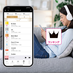 「CDレコミュージック」アプリ上で、実際にユーザーが再生した回数を集計、ランキングにしてアプリ内で公開しています。性別、年代、地域別など、あなたの周りがどんな音楽を聴いているのかチェックすることができます。また、気になるアルバムや曲名をタップすると、その画面からアルバム名やアーティスト名でのインターネット検索もおこなえます。