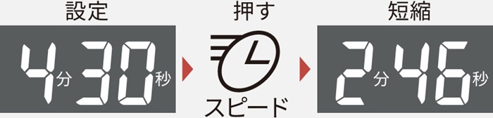 手動あたため(500W/600W)をスタートしてからスピードボタンを押すと、高出力(最大出力1000W)に切り換えてあたため時間を最大約38%短縮*します。