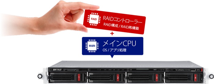メインCPUひとつでアプリの処理からRAIDの構成まで全てを担う従来の「ソフトウェアRAID」に対し、本商品は「ハードウェアRAID」を搭載。メインCPUはOSやアプリを、RAIDコントローラーはRAIDをそれぞれが担当する事で、CPUの負荷が少なく動作が安定。また、信頼性の高いRAID 6も高速で処理できます。