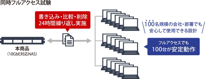 100台のクライアントPCを本商品に接続し、書き込み/比較/削除を一斉に繰り返し、24時間エラーなく終了することを確認。(2025年8月 メーカー調べ)
