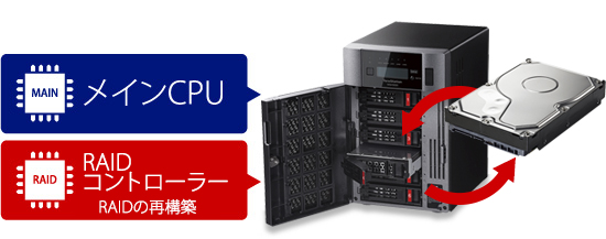 HDD故障時に、電源を落とさず交換できるホットスワップに対応。RAIDコントローラーがRAIDの再構築をします。業務を差し止めることなく通常通りの継続運用が可能です。