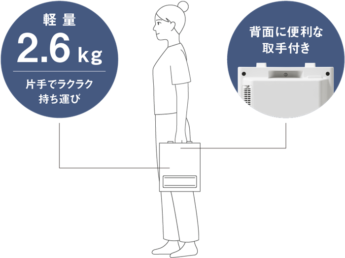 持ち運びもラクラクコンパクトな設計に加えて、2.6 kgの軽量ボディなので持ち運びもラクラク。家中あちこちで使うのに便利です。 |
