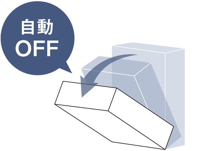 二重安全転倒OFFスイッチとは、地震などで本体が転倒・傾いた際に通電を停止する機構で、転倒OFFスイッチ(押し棒式など)と違い、一度転倒した場合には製品を起こさない限り通電することはありません。