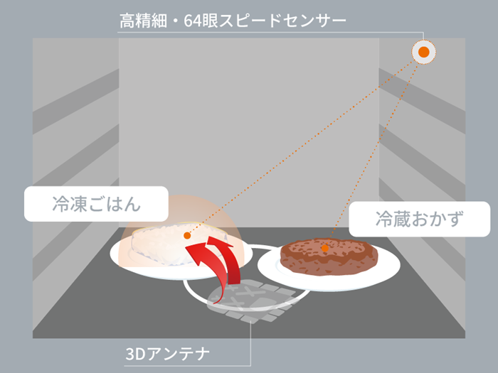 高精細・64眼スピードセンサーが食品の温度・分量を瞬時に見分けて、ムラをおさえてしっかりあたため