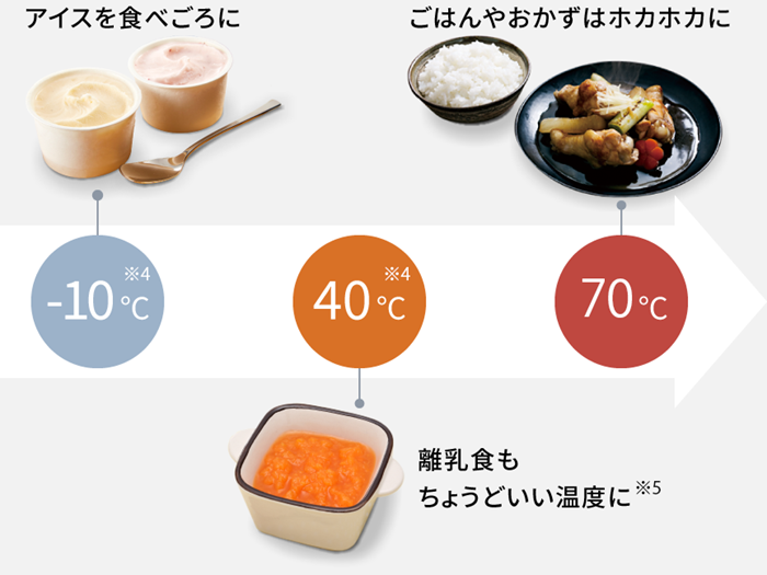 -10℃から90℃まで設定可能。ごはんやおかずもホカホカの食べ頃に、離乳食もぬるめのちょうどいい温度に、カチカチのアイスも適度なやわらかさに。