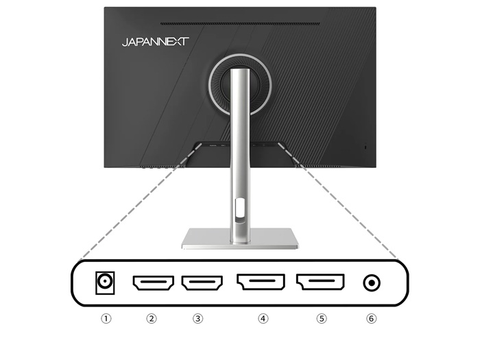 | ①電源ポート ②HDMI-2:2.0 (2560x1440) @144Hz ③HDMI-1:2.0 (2560x1440) @144Hz ④DisplayPort-2:1.4 (2560x1440) @300Hz ⑤DisplayPort-1:1.4 (2560x1440) @300Hz ⑥オーディオ出力 |