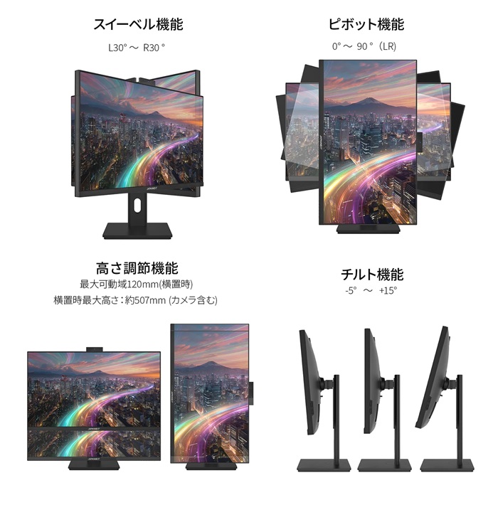 FHD解像度 (1920x1080) USB-C 65W給電 昇降式多機能スタンド搭載