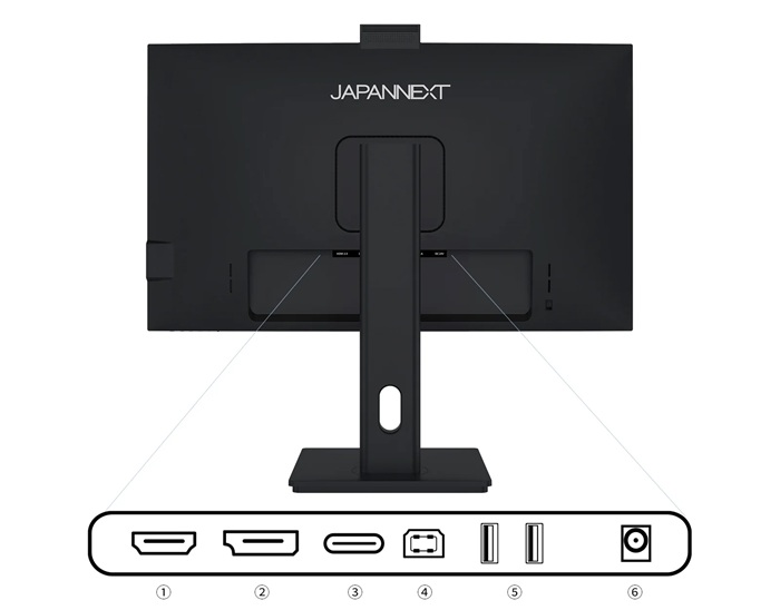 | ①HDMI : 2.0 (1920x1080) @75Hz ②DisplayPort : 1.2 (1920x1080) @75Hz ③USB-C : 1920x1080 @75Hz 最大65W給電 ④USB-B : KVM / WEBカメラ ⑤USB-A × 2 : 2.0 KVM (5V/0.5A) ⑥電源ポート |