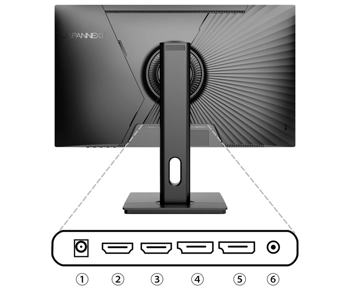 ①電源ポート ②HDMI-2:2.0 (3840x2160) @60Hz ③HDMI-1:2.0 (3840x2160) @60Hz ④DisplayPort-2:1.4 (3840x2160) @60Hz ⑤DisplayPort-1:1.4 (3840x2160) @60Hz ⑥オーディオ出力 |