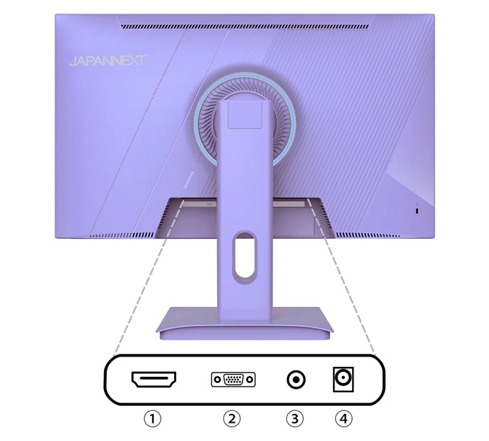 | ①HDMI : 1.4 (1920x1080) @120Hz ②VGA : 1920x1080 @75Hz ③オーディオ出力 ④電源ポート |