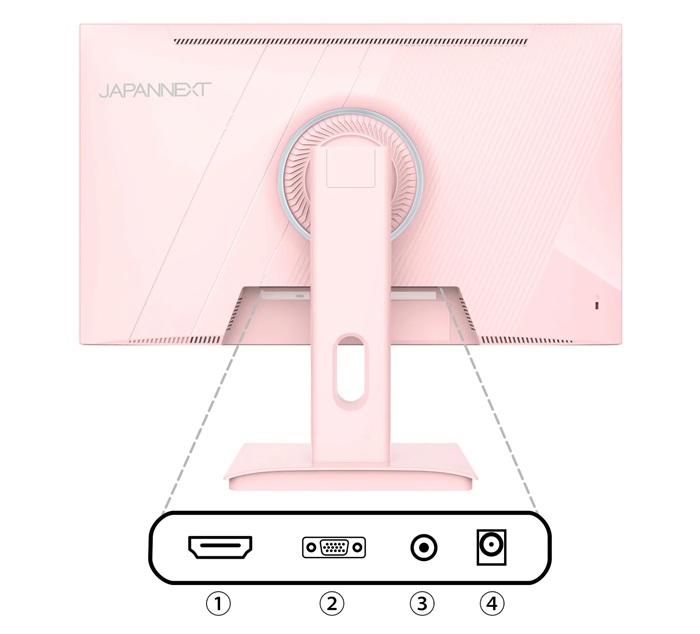 | ①HDMI : 1.4 (1920x1080) @120Hz ②VGA : 1920x1080 @75Hz ③オーディオ出力 ④電源ポート |