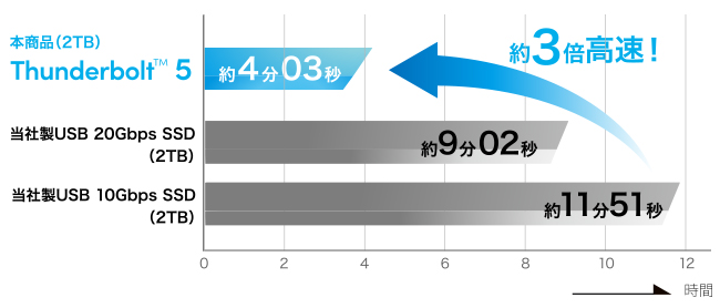 本商品は、国内メーカーとして初めて(※) 最新規格「Thunderbolt™ 5」(最大80Gbps)に対応したSSDです。従来のUSB 10Gbps対応SSDと比べてファイル転送時間は約3倍に向上しました。