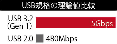 USB 3.2(Gen1)対応で最大5Gbps(理論値)で転送が可能です。